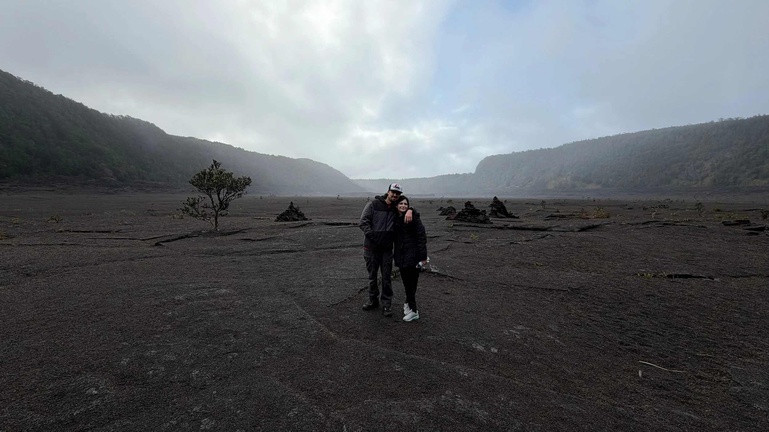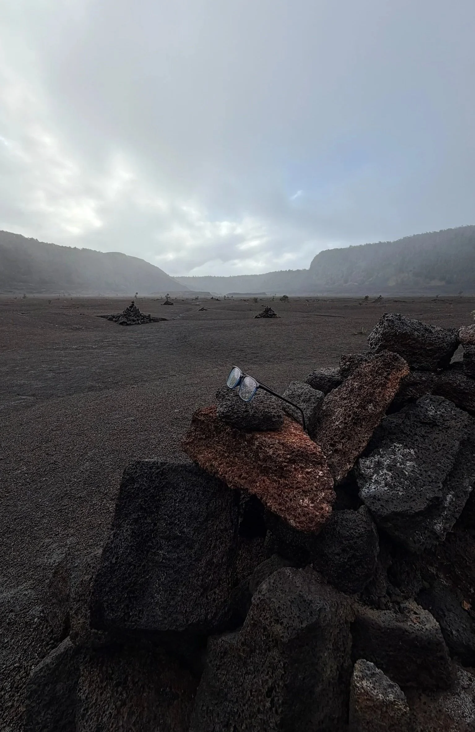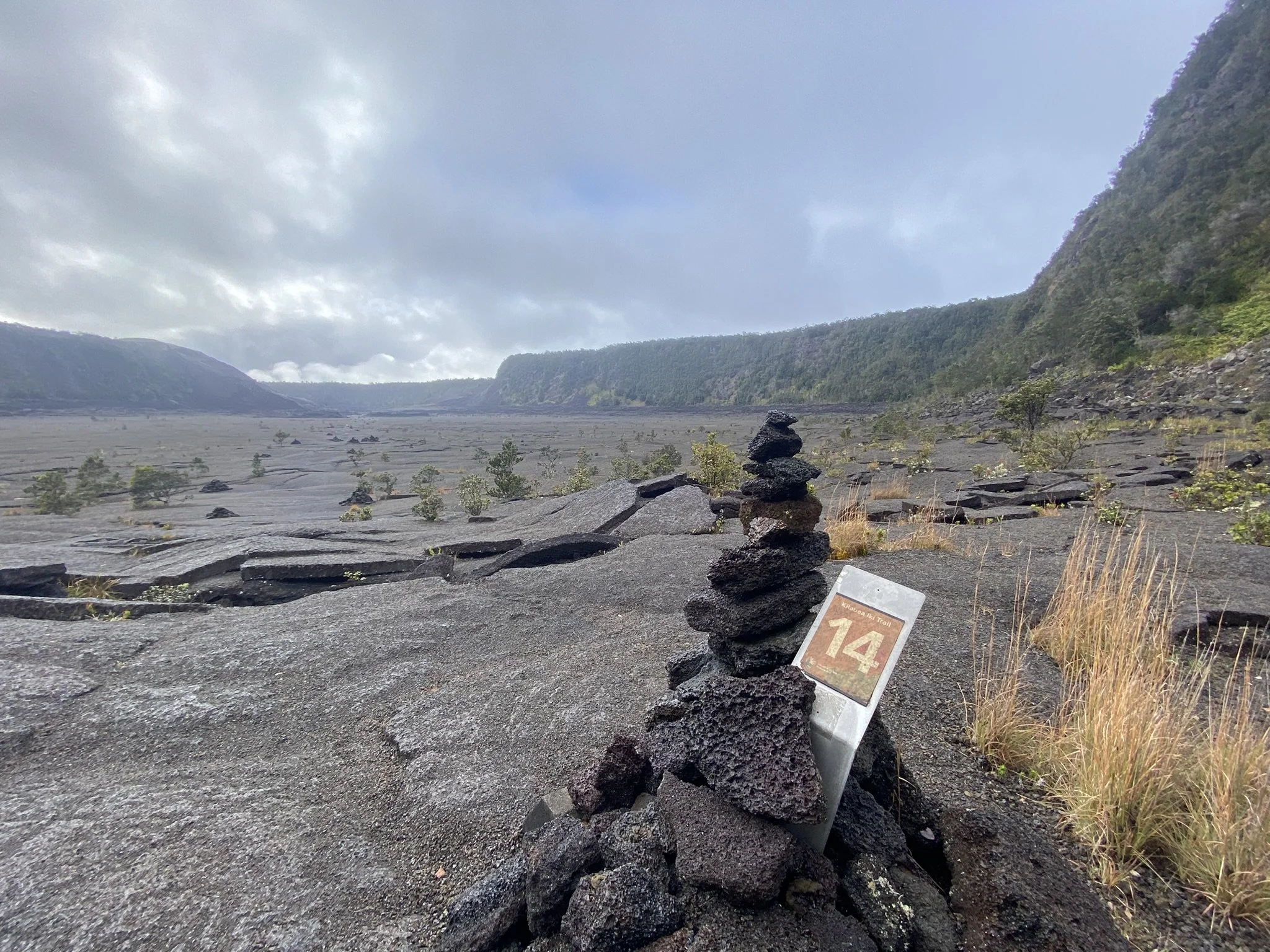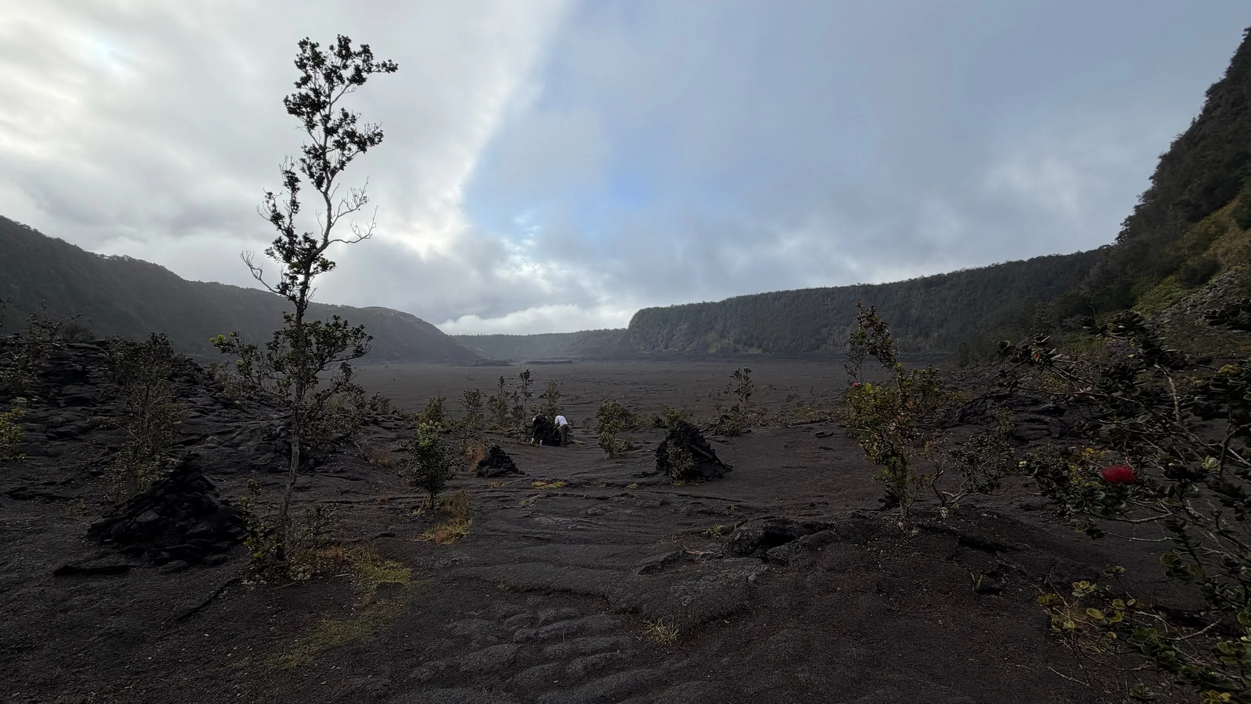 The quiet paths throughout Kilauea Iki (little Kilauea) feel like forbidden, abandoned warzones. While flowers bloom through the wreckage, the destruction from Kilauea's eruption is immeasurable and impossible to forget. The ground doesn't have to be called sacred, as it already emanates that sort of vibe throughout the area. When hiking, there are usually stakes stabbed into the ground to mark the paths that are safe to travel, but here, there are stacks of rocks to show the way.